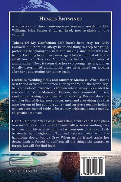 A collection of three contemporary romance novels by D.S. Williams, Julia Sutton & Lorna Read, now available in one volume! Tokens Of My Confection: Life hasn't been easy for Cady Caldwell, but there has always been one thing to keep her going: protecting her younger sisters and making sure their lives are happy. Escaping her abusive marriage, Cady is shunted off to the small town of Garrison, Montana, to live with her paternal grandmother. Now, it seems that her two younger sisters, and an equally determined grandmother, are determined on looking after her... and getting her to live again. Cocktails, Wedding Bells and Summer Madness: When Rose's best friend arrives home from a ten year around-the-world trip, her comfortable existence is thrown into disarray. Persuaded to take on the role of Matron of Honour, she's promised sun, sea, sand and a rousing good time at the wedding. But can she cope with her fear of flying, mosquitoes, men, and everything else that takes her out of her comfort zone - and survive a ten day holiday with an over-excited bride to be, a bossy bridesmaid and a moody, enigmatic best man? Half A Rainbow: After a disastrous affair, artist Leah Mason plans to reinvent herself in a small Cornish village where nothing ever happens. But life is in St. Jofra is far from quiet, and soon Leah befriends her neighbour Nat, and crosses paths with the handsome doctor Joshua Gray. When an old friend tracks her down, Leah is forced to confront all the things she wanted to forget. But will she find love?