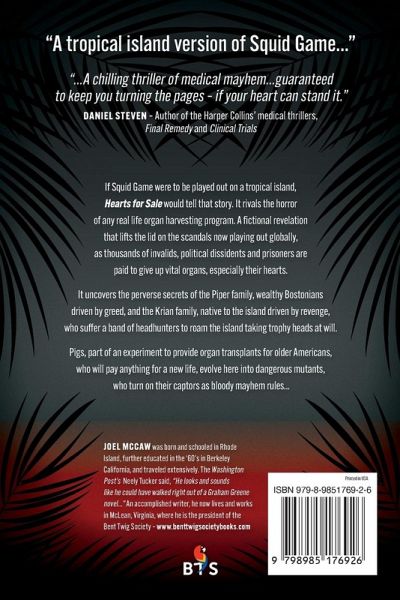 A tropical island version of Squid Game, in which the main characters become involved in deadly and very bloody experiences with wealthy heart patients who urgently need heart transplants. If Squid Game were to be played out on a tropical island, Hearts for Sale would tell that story because it rivals the horror of any real life organ harvesting program. A fictional revelation that lifts the lid on the scandals now playing out globally, as thousands of invalids, political dissidents and prisoners are paid to give up vital organs, especially their hearts. It uncovers the perverse secrets of the Piper family, wealthy Bostonians driven by greed, and the Krian family, native to the island driven by revenge, who suffer a band of headhunters to roam the island taking trophy heads at will. Wild pigs that have escaped from an experiment designed to provide cheap organ transplants, evolve into dangerous mutants, who turn on their captors as bloody mayhem rules.