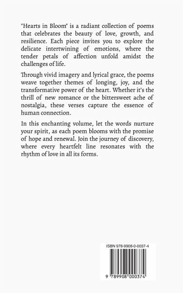 "Hearts in Bloom" is a radiant collection of poems that celebrates the beauty of love, growth, and resilience. Each piece invites you to explore the delicate intertwining of emotions, where the tender petals of affection unfold amidst the challenges of life. Through vivid imagery and lyrical grace, the poems weave together themes of longing, joy, and the transformative power of the heart. Whether it's the thrill of new romance or the bittersweet ache of nostalgia, these verses capture the essence of human connection. In this enchanting volume, let the words nurture your spirit, as each poem blooms with the promise of hope and renewal. Join the journey of discovery, where every heartfelt line resonates with the rhythm of love in all its forms.