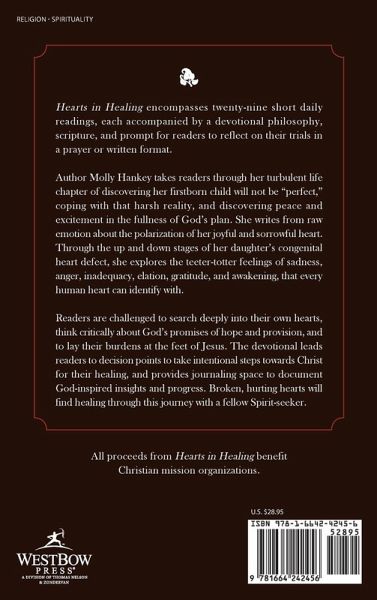 Hearts in Healing encompasses twenty-nine short daily readings, each accompanied by a devotional philosophy, scripture, and prompt for readers to reflect on their trials in a prayer or written format. Author Molly Hankey takes readers through her turbulent life chapter of discovering her firstborn child will not be "perfect," coping with that harsh reality, and discovering peace and excitement in the fullness of God's plan. She writes from raw emotion about the polarization of her joyful and sorrowful heart. Through the up and down stages of her daughter's congenital heart defect, she explores the teeter-totter feelings of sadness, anger, inadequacy, elation, gratitude, and awakening, that every human heart can identify with. Readers are challenged to search deeply into their own hearts, think critically about God's promises of hope and provision, and to lay their burdens at the feet of Jesus. The devotional leads readers to decision points to take intentional steps towards Christ for their healing, and provides journaling space to document God-inspired insights and progress. Broken, hurting hearts will find healing through this journey with a fellow Spirit-seeker.