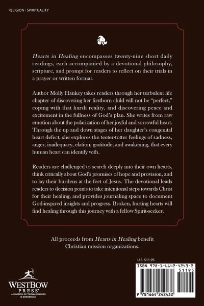 Hearts in Healing encompasses twenty-nine short daily readings, each accompanied by a devotional philosophy, scripture, and prompt for readers to reflect on their trials in a prayer or written format. Author Molly Hankey takes readers through her turbulent life chapter of discovering her firstborn child will not be "perfect," coping with that harsh reality, and discovering peace and excitement in the fullness of God's plan. She writes from raw emotion about the polarization of her joyful and sorrowful heart. Through the up and down stages of her daughter's congenital heart defect, she explores the teeter-totter feelings of sadness, anger, inadequacy, elation, gratitude, and awakening, that every human heart can identify with. Readers are challenged to search deeply into their own hearts, think critically about God's promises of hope and provision, and to lay their burdens at the feet of Jesus. The devotional leads readers to decision points to take intentional steps towards Christ for their healing, and provides journaling space to document God-inspired insights and progress. Broken, hurting hearts will find healing through this journey with a fellow Spirit-seeker.