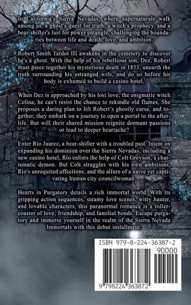 In California's Sierra Nevadas, where supernaturals walk among us, a ghost's quest for truth, a witch's prophecy, and a bear-shifter's lust for power entangle, challenging the boundaries between life and death, love, and ambition. Robert Smith Tardot III awakens in the cemetery to discover he's a ghost. With the help of his rebellious son, Dez, Robert must piece together his mysterious death in 1853, unearth the truth surrounding his estranged wife, and do so before his body is exhumed to build a casino hotel. When Dez is approached by his lost love, the enigmatic witch Celina, he can't resist the chance to rekindle old flames. She proposes a daring plan to lift Robert's ghostly curse, and together, they embark on a journey to open a portal to the afterlife. But will their shared mission reignite dormant passions or lead to deeper heartache? Enter Rio Juarez, a bear-shifter with a troubled past. Intent on expanding his dominion over the Sierra Nevadas, including a new casino hotel, Rio enlists the help of Colt Greyson, a charismatic demon. But Colt struggles with his own ambitions, Rio's unrequited affections, and the allure of a naive yet captivating human city councilwoman. Hearts in Purgatory details a rich immortal world. With its gripping action sequences, steamy love scenes, witty banter, and lovable characters, this paranormal romance is a rollercoaster of love, friendship, and familial bonds. Escape purgatory and immerse yourself in the realm of the Sierra Nevada Immortals with this debut installment.