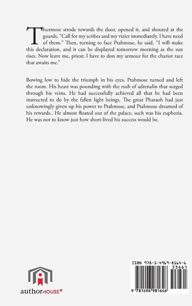 Thutmose strode towards the door, opened it, and shouted at the guards, "Call for my scribes and my vizier immediately. I have need of them." Th en, turning to face Ptahmose, he said, "I will make this declaration, and it can be displayed tomorrow morning as the sun rises. Now leave me, priest; I have to don my armour for the chariot race that awaits me." Bowing low to hide the triumph in his eyes, Ptahmose turned and left the room. His heart was pounding with the rush of adrenalin that surged through his veins. He had successfully achieved all that he had been instructed to do by the fallen light beings. Th e great Pharaoh had just unknowingly given up his power to Ptahmose, and Ptahmose dreamed of his rewards.. He almost fl oated out of the palace, such was his euphoria. He was not to know just how short-lived his success would be.