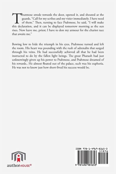 Thutmose strode towards the door, opened it, and shouted at the guards, "Call for my scribes and my vizier immediately. I have need of them." Th en, turning to face Ptahmose, he said, "I will make this declaration, and it can be displayed tomorrow morning as the sun rises. Now leave me, priest; I have to don my armour for the chariot race that awaits me." Bowing low to hide the triumph in his eyes, Ptahmose turned and left the room. His heart was pounding with the rush of adrenalin that surged through his veins. He had successfully achieved all that he had been instructed to do by the fallen light beings. Th e great Pharaoh had just unknowingly given up his power to Ptahmose, and Ptahmose dreamed of his rewards.. He almost fl oated out of the palace, such was his euphoria. He was not to know just how short-lived his success would be.