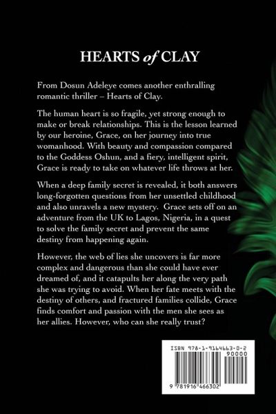 From Dosun Adeleye comes another enthralling romantic thriller - Hearts of Clay. The human heart is so fragile, yet strong enough to make or break relationships. This is the lesson learned by our heroine, Grace, on her journey into true womanhood. With beauty and compassion compared to the Goddess Oshun, and a fiery, intelligent spirit, Grace is ready to take on whatever life throws at her. When a deep family secret is revealed, it both answers long-forgotten questions from her unsettled childhood and also unravels a new mystery. Grace sets off on an adventure from the UK to Lagos, Nigeria, in a quest to solve the family secret and prevent the same destiny from happening again. However, the web of lies she uncovers is far more complex and dangerous than she could have ever dreamed of, and it catapults her along the very path she was trying to avoid. When her fate meets with the destiny of others, and fractured families collide, Grace finds comfort and passion with the men she sees as her allies. However, who can she really trust? Join Grace on her adventure, from the hands of rogues to the Palace of Ikoko, in a tale of intrigue, love and peril, which crosses continents and generations. Is Grace destined to repeat the mistakes she blames her mother for? Is blood thicker than water, or will love prevail? Find out in Hearts of Clay, a romantic thriller which will make your heart race.