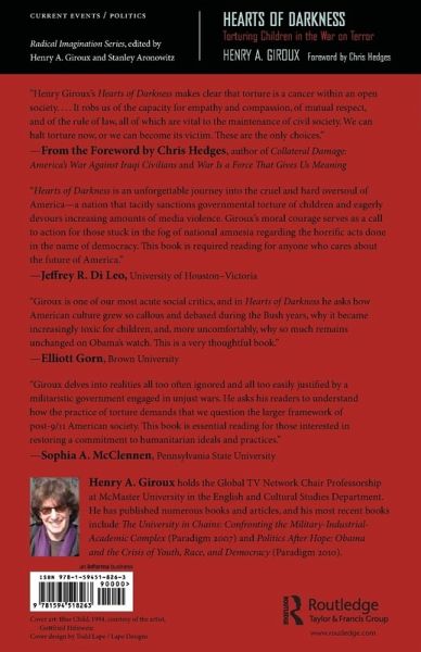 George W. Bush's war on terror defended torture as a matter of official policy and furthered an already emergent culture of cruelty. As torture became normalized in the Bush era, it not only corrupted American ideals and political culture, it also passed over to the dark side in sanctioning the unimaginable and unspeakable: the torture of children. This shocking book documents cases of child torture by American military personnel, many of which have never been reported in the media. Giroux raises serious challenges the Obama administration must address in light of this shameful period in American history if it wants to restore democratic culture. Going further than simply blaming those at the top, Hearts of Darkness also raises questions about the collusion of the media, educators, the criminal justice system and other institutions that have enabled a culture that accepts the torture of children.