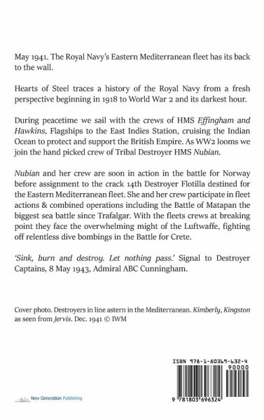 In July 1918 Herbert Leeder joined the Royal Navy beginning a career spanning 27 years and 16 ships. In Hearts of Steel, Jim Carter follows the career of his great grandfather from a historical perspective, concentrating on three ships in particular. The cruisers Effingham and Hawkins were the flagships of the East Indies Squadron (1925 - 1927 and 1932 - 1935) based out of Trincomalee in Ceylon (Sri-Lanka). Their commissions, recorded in two publications written by their crews are drawn on by the author to illustrate like aboard a warship of the period. Exotic foreign ports, trips ashore, fishing with dynamite, even tragedy. In 1939, Herbert joined the hand-picked crew of the Tribal-class destroyer HMS Nubian experiencing 11 of her 13 Battle honours. These include Norway, the battles of Calabria, Matapan and the destroyer action at SFAX where the author refers to the transcript from a subsequent enquiry to describe the destruction of an Italian convoy and the sinking of HMS Mohawk. At a constant state of readiness, the crews of the Eastern Mediterranean fleet were pushed to their limits, culminating in the battle for Crete in May 1941 where the Royal Navy paid a very high price, HMS Nubian being severely damaged with casualties.