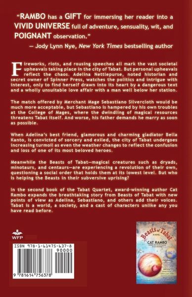 In the second book of The Tabat Quartet, Nebula award-winning author Cat Rambo expands the breathtaking story from Beasts of Tabat with new points of view as Adelina, Sebastiano, and others add their voices. Tabat is a world, a society, and a cast of characters unlike any you have read before. Fireworks. Riots. Rousing speeches. All markers of the vast societal upheavals taking place in the city of Tabat. But personal upheavals reflect the chaos. Adelina Nettlepurse, noted historian and secret owner of Spinner Press, watches the politics and intrigue with interest, only to find herself drawn into its heart by a dangerous text and a wholly unsuitable love affair with a man well below her station. The match offered by Merchant Mage Sebastiano Silvercloth would be much more acceptable, but Sebastiano is hampered by his own troubles at the College of Mages, where the dwindling of magical resources threatens Tabat itself. And worse, his father demands he marry as soon as possible. When Adelina's best friend, glamorous and charming gladiator Bella Kanto, is convicted of sorcery and exiled, the city of Tabat undergoes increasing turmoil as even the weather changes to reflect the confusion and loss of one of its most beloved heroes. Meanwhile the Beasts of Tabat-magical creatures such as dryads, minotaurs, and centaurs-are experiencing a revolution of their own, questioning a social order that holds them at its lowest level. But who is helping the Beasts in their subversive uprising? "a fascinating world of magic, intrigue, and revolution."-Publishers Weekly on Beasts of Tabat