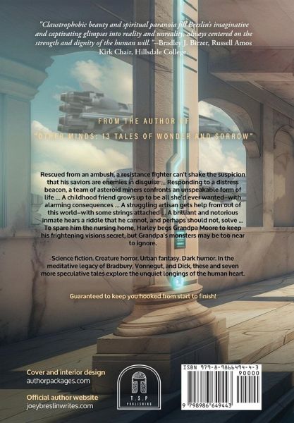 "Claustrophobic beauty and spiritual paranoia fill Breslin's imaginative and captivating glimpses into reality and unreality, always centered on the strength and dignity of the human will."--Bradley J. Birzer, Russell Amos Kirk Chair, Hillsdale College From the author of "Other Minds: 13 Tales of Wonder and Sorrow" Rescued from an ambush, a resistance fighter can't shake the suspicion that his saviors are his enemies in disguise ... Responding to a distress beacon, a team of asteroid miners confronts an unspeakable form of life ... A childhood friend grows up to be all she'd ever wanted-with alarming consequences ... A struggling artisan gets help from out of this world-with some strings attached ... A brilliant and notorious inmate hears a riddle that he cannot, and perhaps should not, solve ... To spare him the nursing home, Harley begs Grandpa Moore to keep his frightening visions secret, but Grandpa's monsters may be too near to ignore. Science fiction. Creature horror. Urban fantasy. Dark humor. In the meditative legacy of Bradbury, Vonnegut, and Dick, these and seven more speculative tales explore the unquiet longings of the human heart. Guaranteed to keep you hooked from start to finish!