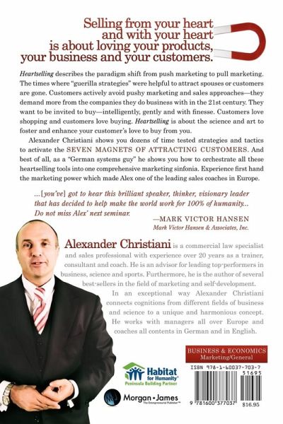 Heartselling is about selling from your heart and with your heart. It describes the paradigm shift from push marketing to pull marketing. Customers actively avoid pushy marketing and sales approaches and demand more from the companies they do business with. Heartselling is about the science and art of fostering your customer's love to buy from you. Alexander Christiani shows dozens of time tested strategies and tactics to activate the seven magnets of attracting customers. He shows how to orchestrate all these heartselling tools into one comprehensive marketing sinfonia.