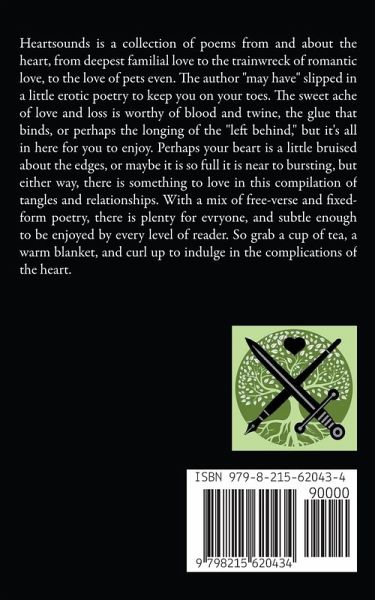 Heartsounds is a collection of poems from and about the heart, from deepest familial love to the trainwreck of romantic love, to the love of pets even. The author "may have" slipped in a little erotic poetry to keep you on your toes. The sweet ache of love and loss is worthy of blood and twine, the glue that binds, or perhaps the longing of the "left behind," but it's all in here for you to enjoy. Perhaps your beart is a little bruised about the edges, or maybe it is so full it is near to bursting, but either way, there is something to love in this compilation of tangles and relationships. With a mix of free-verse and fixed-form poetry, there is plenty for evryone, and subtle enough to be enjoyed by every level of reader. So grab a cup of tea, a warm blanket, and curl up to indulge in the complications of the heart.