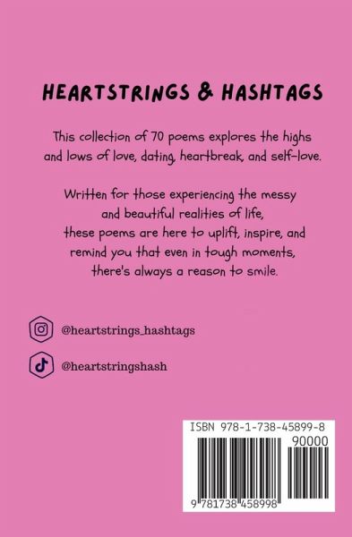 Heartstrings & Hashtags: A Collection of 70 Poems on Love, Heartbreak, and Self-Love By Marisa Hawkes Dive into the poignant, witty, and heartfelt world of Heartstrings & Hashtags, a collection of 70 modern poems tailored for Gen Z and Millennials, exploring the raw and relatable themes of love, dating, heartbreak, and self-discovery. From tender moments of connection and the bittersweet stages of a breakup to the empowering journey of finding self-love, the poet captures the intricacies of human emotion with both humor and sincerity. Whether you're navigating the thrill of a new romance, enduring the sting of lost love, or embracing the beauty of self-reinvention, this collection will resonate deeply. Each poem serves as a snapshot of modern relationships and life, complete with hashtags that bring the digital age into the heart of timeless feelings. Perfect for the social media generation and anyone who's loved, lost, and found themselves along the way, Heartstrings & Hashtags is a reminder that through every twist and turn, you're never alone.