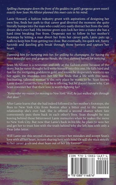 Spilling champagne down the front of the goddess in gold's gorgeous gown wasn't exactly how Sean McAllister planned this meet-cute in his mind. Lanie Howard, a fashion industry grunt with aspirations of designing her own line, finds her path to that career goal diverted the moment she quite literally bumps into the man who could very easily distract her from the only dream she's ever had. His intense green eyes lock her into a trance she has a hard time breaking free from. Desperate not to follow in her mother's footsteps by letting a man divert her from her career path, Lanie puts up walls to keep him from getting too close. But eventually, his quick wit, funny factoids and dazzling grin break through those barriers and capture her heart. Damning him for bumping into her, for spilling his champagne, for having the most beautiful eyes and gorgeous hands, she then damned herself for noticing. Sean McAllister is a newsman and only at the fashion event because of the story, but he never thought he'd write himself into this one. He falls hard and fast for the intriguing goddess in gold, and knows he desperately wants to see her again. He stumbles into her life but finds that a life with this sassy, fascinating, talented woman is the very place he wants to be. Sean knows Lanie doesn't trust the love that he is offering, but he doesn't know why. Can Sean convince her that their love is worth fighting for? "Remember my reason for moving to New York? Well, he just walked right through that door." After Lanie learns that she had indeed followed in her mother's footsteps, she flees to New York City from Boston after a bitter end to the sweetest relationship she's ever had. She is offered a second chance when fate conveniently puts them back in each other's lives. Sean thought he was leaving behind those bittersweet Lanie memories when he makes the move to New York City. But now that Lanie's back in his life, he plans to woo her and get her to trust him with the truth behind why she left him with only a Dear John letter. Will Lanie use this second chance to correct her mistakes and accept Sean's love with all her heart, in turn sharing hers with him? Or will she stick strictly to her career goals and shut Sean out of her life forever?