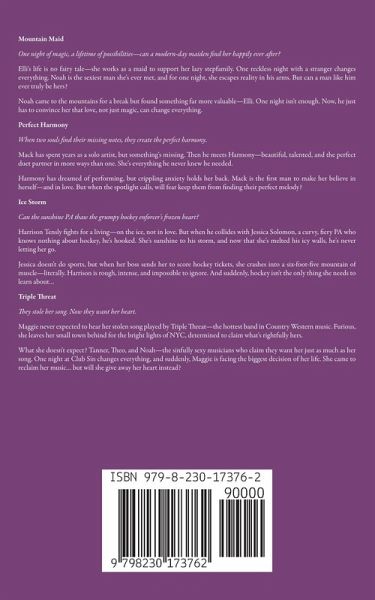 Mountain Maid One night of magic, a lifetime of possibilities-can a modern-day maiden find her happily ever after? Elli's life is no fairy tale-she works as a maid to support her lazy stepfamily. One reckless night with a stranger changes everything. Noah is the sexiest man she's ever met, and for one night, she escapes reality in his arms. But can a man like him ever truly be hers? Noah came to the mountains for a break but found something far more valuable-Elli. One night isn't enough. Now, he just has to convince her that love, not just magic, can change everything. Perfect Harmony When two souls find their missing notes, they create the perfect harmony. Mack has spent years as a solo artist, but something's missing. Then he meets Harmony-beautiful, talented, and the perfect duet partner in more ways than one. She's everything he never knew he needed. Harmony has dreamed of performing, but crippling anxiety holds her back. Mack is the first man to make her believe in herself-and in love. But when the spotlight calls, will fear keep them from finding their perfect melody? Ice Storm Can the sunshine PA thaw the grumpy hockey enforcer's frozen heart? Harrison Tensly fights for a living-on the ice, not in love. But when he collides with Jessica Solomon, a curvy, fiery PA who knows nothing about hockey, he's hooked. She's sunshine to his storm, and now that she's melted his icy walls, he's never letting her go. Jessica doesn't do sports, but when her boss sends her to score hockey tickets, she crashes into a six-foot-five mountain of muscle-literally. Harrison is rough, intense, and impossible to ignore. And suddenly, hockey isn't the only thing she needs to learn about... Triple Threat They stole her song. Now they want her heart. Maggie never expected to hear her stolen song played by Triple Threat-the hottest band in Country Western music. Furious, she leaves her small town behind for the bright lights of NYC, determined to claim what's rightfully hers. What she doesn't expect? Tanner, Theo, and Noah-the sinfully sexy musicians who claim they want her just as much as her song. One night at Club Sin changes everything, and suddenly, Maggie is facing the biggest decision of her life. She came to reclaim her music... but will she give away her heart instead?