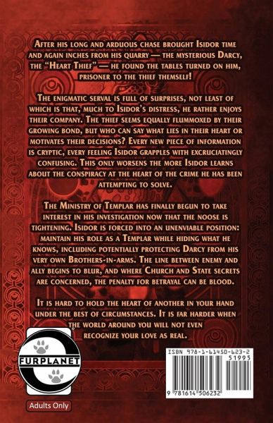 After his long and arduous chase brought Isidor time and again inches from his quarry - the mysterious Darcy, the "Heart Thief" - he found the tables turned on him, prisoner to the thief themself! The enigmatic serval is full of surprises, not least of which is that, much to Isidor's distress, he rather enjoys their company. The thief seems equally flummoxed by their growing bond, but who can say what lies in their heart or motivates their decisions? Every new piece of information is cryptic, every feeling Isidor grapples with excruciatingly confusing. This only worsens the more Isidor learns about the conspiracy at the heart of the crime he has been attempting to solve. The Ministry of Templar has finally begun to take interest in his investigation now that the noose is tightening. Isidor is forced into an unenviable position: maintain his role as a Templar while hiding what he knows, including potentially protecting Darcy from his very own Brothers-in-arms. The line between enemy and ally begins to blur, and where Church and State secrets are concerned, the penalty for betrayal can be blood. It is hard to hold the heart of another in your hand under the best of circumstances. It is far harder when the world around you will not even recognize your love as real.