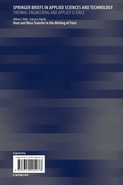 This Brief is aimed at engineers and researchers involved in the refrigeration industry: specifically, those interested in energy utilization and system efficiency. The book presents what the authors believe is the first comprehensive frost melting study involving all aspects of heat and mass transfer. The volume's description of in-plane and normal digital images of frost growth and melting is also unique in the field, and the digital analysis technique offers an advantage over invasive measurement methods. The scope of book's coverage includes modeling and experimentation for the frost formation and melting processes. The key sub-specialties to which the book are aimed include refrigeration system analysis and design, coupled heat and mass transfer, and phase-change processes.