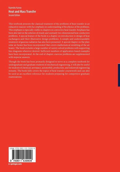 This textbook presents the classical treatment of the problems of heat transfer in an exhaustive manner with due emphasis on understanding of the physics of the problems. This emphasis will be especially visible in the chapters on convective heat transfer. Emphasis is also laid on the solution of steady and unsteady two-dimensional heat conduction problems. Another special feature of the book is a chapter on introduction to design of heat exchangers and their illustrative design problems. A simple and understandable treatment of gaseous radiation has been presented. A special chapter on flat plate solar air heater has been incorporated that covers mathematical modeling of the air heater. The chapter on mass transfer has been written looking specifically at the needs of the students of mechanical engineering. The book includes a large number and variety of solved problems with supporting line diagrams. A number of application-based examples have been incorporated where applicable.The end-of-chapter exercise problems are supplemented with stepwise answers. Though the book has been primarily designed to serve as a complete textbook for undergraduate and graduate students of mechanical engineering, it will also be useful for students of chemical, aerospace, automobile, production, and industrial engineering streams. The book fully covers the topics of heat transfer coursework and can also be used as an excellent reference for students preparing for competitive graduate examinations.