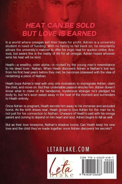 Heat can be sold but love is earned. In a world where heats are sold for profit, Adrien is a university student in need of funding. With no family to fall back on, he reluctantly allows the university's matcher to offer his first heat for auction online. Anxious, but aware this is the reality of life for his kind, Adrien hopes whoever wins will be good to him. Heath-a wealthy, older man-buys Adrien's heat with an ulterior motive. When their undeniable passion shocks him, Heath begins to fall for the young man. Adrien doesn't know what to make of the mysterious stranger he's spending his first heat with, but he's soon swept away and surrenders to Heath entirely. Later, Heath secrets him away to his immense and secluded home where Heath grows to love Adrien. Unaware of Heath's history, Adrien begins to fall as well. As their love blossoms, the shadows of the past loom. Can Heath keep his new love once Adrien discovers his secrets? Heat for Sale is a stand-alone m/m erotic romance by Leta Blake. Infused with a du Maurier Rebecca-style secret, it features a well-realized fictional universe, an age-gap, and scorching hot scenes. ¿Originally published under the same title through Leta Blake's former pen name Blake Moreno.