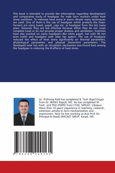 This book is intended to provide the information regarding development and comparative study of headgear for male farm workers under heat stress condition. To minimize heat stress in warm climate many techniques are used. One of them is the use of headgear which protects the head. Farmers are using towel, pagdi, caps etc. as headgear from the last many years. However they are less effective because either they do not cover complete head or do not provide proper shadow and ventilation. Scientists have also worked on many headgears like white pagdi, hat with 90 mm brim width and headgear with solar fan system. The use of headgear reduced the effect of heat stress significantly on thermal parameters, physiological parameters and physical discomfort parameters. The developed solar hat with air circulation mechanism was found best among the headgear in reducing the ill effects of heat stress.