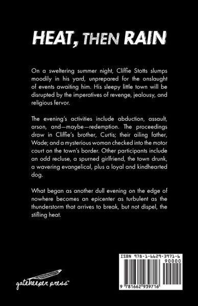 On a sweltering summer night, Cliffie Stotts slumps moodily in his yard, unprepared for the onslaught of events awaiting him. His sleepy little town will be disrupted by the imperatives of revenge, jealousy, and religious fervor. The evening's activities include abduction, assault, arson, and-maybe-redemption. The proceedings draw in Cliffie's brother Curtis, their ailing father Wade, and a mysterious woman checked into the motor court on the town's border. Other participants include an odd recluse, a spurned girlfriend, the town drunk, a wavering evangelical, plus a loyal and kind-hearted dog. What began as another dull evening on the edge of nowhere becomes an epicenter as turbulent as the thunderstorm that arrives to break, but not dispel, the stifling heat.