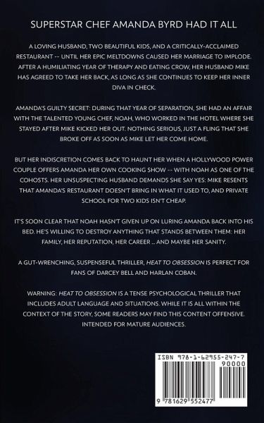 From the best-selling author of Pretty Killer, No Justice, and 12 comes Heat To Obsession, a gripping new stand-alone thriller by Nolon King. Superstar chef Amanda Byrd had it all - a loving husband, two beautiful kids, and a critically-acclaimed restaurant - until her epic meltdowns caused her marriage to implode. After a humiliating year of therapy and eating crow, her husband Mike has agreed to take her back, as long as she continues to keep her inner diva in check. Amanda's guilty secret: during that year of separation, she had an affair with the talented young chef, Noah, who worked in the hotel where she stayed after Mike kicked her out. Nothing serious, just a fling that she broke off as soon as Mike let her come home. But her indiscretion comes back to haunt her when a Hollywood power couple offers Amanda her own cooking show - with Noah as one of the cohosts. Her unsuspecting husband demands she say yes: Mike resents that Amanda's restaurant doesn't bring in what it used to, and private school for two kids isn't cheap. It's soon clear that Noah hasn't given up on luring Amanda back into his bed. He's willing to destroy anything that stands between them: her family, her reputation, her career ... and maybe her sanity. A gut-wrenching, suspenseful thriller, Heat To Obsession is perfect for fans of Darcey Bell and Harlan Coban.