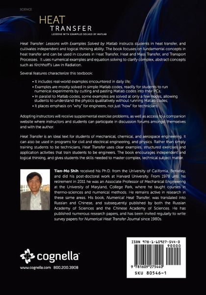 "Heat Transfer: Lessons with Examples Solved by Matlab instructs students in heat transfer, and cultivates independent and logical thinking ability. The book focuses on fundamental concepts in heat transfer and can be used in courses in Heat Transfer, Heat and Mass Transfer, and Transport Processes. It uses numerical examples and equation solving to clarify complex, abstract concepts such as Kirchhoff's Law in Radiation. Several features characterize this textbook: ¿It includes real-world examples encountered in daily life; ¿Examples are mostly solved in simple Matlab codes, readily for students to run numerical experiments by cutting and pasting Matlab codes into their PCs; ¿In parallel to Matlab codes, some examples are solved at only a few nodes, allowing students to understand the physics qualitatively without running Matlab codes; ¿It places emphasis on ""why"" for engineers, not just ""how"" for technicians. Adopting instructors will receive supplemental exercise problems, as well as access to a companion website where instructors and students can participate in discussion forums amongst themselves and with the author. Heat Transfer is an ideal text for students of mechanical, chemical, and aerospace engineering. It can also be used in programs for civil and electrical engineering, and physics. Rather than simply training students to be technicians, Heat Transfer uses clear examples, structured exercises and application activities that train students to be engineers. The book encourages independent and logical thinking, and gives students the skills needed to master complex, technical subject matter. " " Tien-Mo Shih received his Ph.D. from the University of California, Berkeley, and did his post-doctoral work at Harvard University. From 1978 until his retirement in 2011 he was an Associate Professor of Mechanical Engineering at the University of Maryland, College Park, where he taught courses in thermo-sciences and numerical methods. He remains active in research in these same areas. His book, Numerical Heat Transfer, was translated into Russian and Chinese, and subsequently published by both the Russian Academy of Sciences and the Chinese Academy of Sciences. He has published numerous research papers, and has been invited regularly to write survey papers for Numerical Heat Transfer Journal since 1980s.