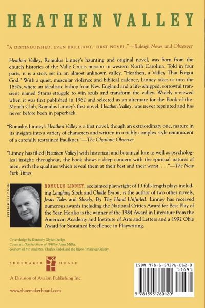 Heathen Valley, Romulus Linney's haunting and original novel, was born from the church histories of the Valle Crucis mission in western North Carolina. Told in four parts, it is a story set in an almost unknown valley, "Heathen, a valley That Forgot God." With a quiet, muscular violence and biblical grace that readers of Cormac McCarthy will recognize, Linney takes us into the 1850s, where an idealistic Bishop from New England and a life-whipped, sorrowful transient named Starns, struggle to win souls and transform the valley. Widely reviewed when it was first published in 1962 and selected as an alternate for the Book of the Month Club, Romulus Linney's first novel Heathen Valley was never reprinted and has never before been in paperback. "Starns was thirty-two years old that night, but he looked fifty. He was like a much older man who comes late in life to what learning he possesses, and therefore has no fear of what he knows he will never understand." from Heathen Valley