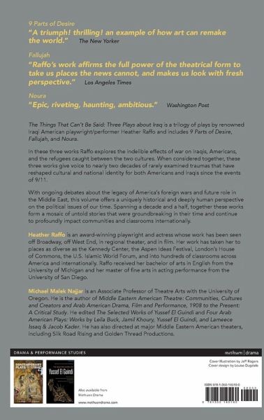 The Things That Can't Be Said: Three Plays About Iraq is a trilogy of plays by renowned Iraqi American playwright/performer Heather Raffo including 9 Parts of Desire, Fallujah: The First Opera about the Iraq War, and Noura. In these three works Raffo explores the indelible effects of war on Iraqis, Americans, and the refugees caught between the two cultures. When considered together, these three works give voice to nearly two decades of rarely examined traumas that have reshaped cultural and national identity for both Americans and Iraqis since the events of 9/11. Heather Raffo is a renowned playwright and performer whose work has been described by The New Yorker as an example of "how art can remake the world." An American with Iraqi heritage, her work is seen as a rare bridge between western and eastern cultures. With ongoing debates about the legacy of America's foreign wars and future role in the Middle East, this volume offers a uniquely historical and deeply human perspective on the political issues of our time. Spanning a decade and a half, together these works form a mosaic of untold stories that were ground breaking in their time and continue to profoundly impact communities and classrooms internationally. 9 Parts of Desire (2003): "First Choice/The Best Shows in London" by The Times, and as one of the "Five Best Plays" in London by The Independent. Its award winning, Off-Broadway premiere ran for nine sold out months and was a critics pick of the The New York Times, Time Out, and Village Voice. The play then received productions in nearly every major regional theatre market in American before being translated for international productions in Brazil, Greece, Sweden, Hungary, India, Turkey, Malta, France, Iraq, Egypt, and Israel. It was the first commercial hit on a national and international stage by an Arab American playwright helping to birth a new genre of Middle Eastern American Theatre. Fallujah (2016) received its world premiere at Long Beach Opera before transferring to NYC Opera. The first ever opera about the Iraq War it tells a U.S. Marine's account of the battle of Fallujah it focuses on moral injury and veteran suicide. Noura (2018) won the L. Arnold Weissberger New Play Award and was hailed "The Most Ambitious Premiere" of the Women's Voices Theatre Festival by The Washington Post and "stirringly powerful" by The New York Times. Told from inside the marriage of an Iraqi family, the play explores the lingering cost of exile for both recent refugees and more established American immigrants. Drawing inspiration from Ibsen's A Doll's Hous and championed as a first of its kind feminist refugee narrative, it is already being included in university curriculum both in America and abroad.