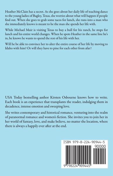 Heather McClain has a secret. As she goes about her daily life of teaching dance to the young ladies of Bagley, Texas, she worries about what will happen if people find out. When she goes to grab some tacos for lunch, she runs into a man who she immediately knows is meant to be the man she spends her life with. While Michael Muir is visiting Texas to buy a bull for his ranch, he stops for lunch and his entire world changes. When he spots Heather in the same line he's in, he knows he wants to spend the rest of his life with her. Will he be able to convince her to alter the entire course of her life by moving to Idaho with him? Or will they have to pine for each other from afar?