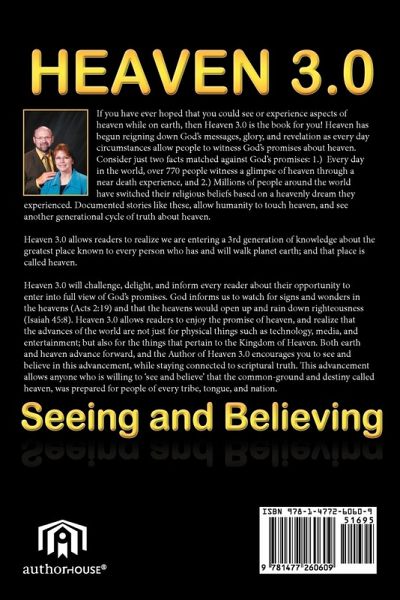 If you have ever hoped that you could see or experience aspects of heaven while on earth, then Heaven 3.0 is the book for you! Heaven has begun reigning down God's messages, glory, and revelation as every day circumstances allow people to witness God promises about heaven. Consider just two facts matched against God's promises: 1) every day in the world, over 770 people witness a glimpse of heaven through a near death experience, and 2.) Millions of people around the world have switched their religious beliefs based on a heavenly dream they experienced. Documented stories like these, allow humanity to touch heaven, and see another generational cycle of truth about heaven. Heaven 3.0 allows readers to realize we are entering a 3rd generation of knowledge about the greatest place know to every person who has and will walk planet earth; and that place is called heaven. Heaven 3.0 will challenge, delight, and inform every reader about their opportunity to enter into full view of God's promises. God informs us to watch for signs and wonders in the heavens (Acts 2:19) and that the Heavens would open up and rain down righteousness (Isaiah 45:8). Heaven 3.0 allows readers to enjoy the promise of heaven, and realize that the advances of the world are not just for physical things such as technology, media, and entertainment; but also for the things that pertain to the Kingdom of Heaven. Both Heaven, as well as earth advance, and the Author of Heaven 3.0 encourages you to see and believe in the advancement, while staying connected to scriptural truth. This advancement allows anyone who is willing to 'see and believe' that the common-ground and destiny called heaven, was prepared for people of every tribe, tongue, and nation.