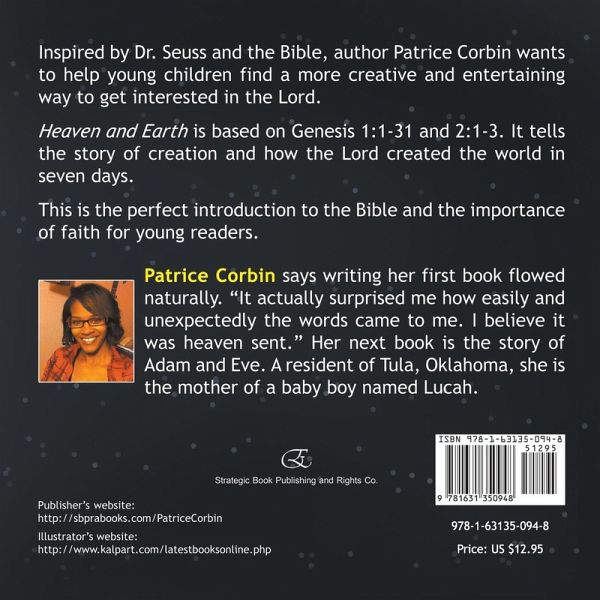 Inspired by Dr. Seuss and the Bible, author Patrice Corbin wants to help young children find a more creative and entertaining way to get interested in the Lord. Heaven and Earth is based on Genesis 1:1-31 and 2:1-3. It tells the story of creation and how the Lord created the world in seven days. This is the perfect introduction to the Bible and the importance of faith for young readers. Patrice Corbin says writing her first book flowed naturally. "It actually surprised me how easily and unexpectedly the words came to me. I believe it was heaven sent." Her next book is the story of Adam and Eve. A resident of Tula, Oklahoma, she is the mother of a baby boy named Lucah. Publisher's website: http://sbprabooks.com/PatriceCorbin