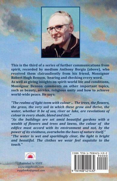 The third book of a series of spirit communications from Monsignor Robert Hugh Benson, received clairaudiently by medium Anthony Borgia, who later checked the accuracy of what he had written with Benson through a good trance medium with whom he sat for 25 years. In these eight chapters, as well as giving insights on spirit-world life, the building of an extension to his home and other conditions, Monsignor comments on important topics, such as beauty, service, religious unity and how to achieve world-wide peace. Although originally transmitted at the end of World War II, his words still apply to our lives today, particularly in regard to unity and world peace. He writes; "The realms of light teem with colour ... The trees, the flowers, the grass, the very soil in which these grow and thrive, the water, whether It be of sea, river or lake, are revelations of colour in every shade, blend and tint." "As the buildings are set amid beautiful gardens with a wealth of flowers and trees and lawns, the colour of the edifice must accord with its environment and not, by the power of its vividness, overwhelm the hues of nature itself." "The water is wet and sparklingly clear, the light is bright and beautiful. The clothes we wear feel exquisite to the touch." Contents 1. My Home Enlarged 2. Past, Present, Future 3. Colour 4. Mistaken Views 5. Beauty 6. Service 7. Christian Unity 8. Peace on Earth