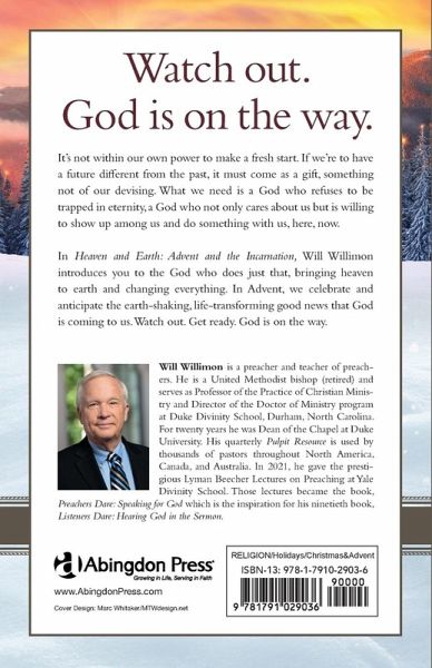 Watch out. God is on the way. It's not within our own power to make a fresh start. If we're to have a future different from the past, it must come as a gift, something not of our devising. What we need is a God who refuses to be trapped in eternity, a God who not only cares about us but is willing to show up among us and do something with us, here, now. In Heaven and Earth: Advent and the Incarnation, Will Willimon introduces you to the God who does just that, bringing heaven to earth and changing everything. In Advent we celebrate and anticipate the earth-shaking, life-transforming good news that God is coming to us. Watch out. Get ready. God is on the way. Additional components to use the book as a four-week small group study include a leader guide and DVD/Video Sessions featuring Will Willimon.