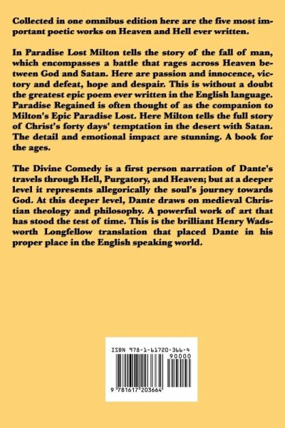 Collected in one omnibus edition here are the five most important poetic works on Heaven and Hell ever written. In Paradise Lost Milton tells the story of the fall of man, which encompasses a battle that rages across Heaven between God and Satan. Here are passion and innocence, victory and defeat, hope and despair. This is without a doubt the greatest epic poem ever written in the English language. Paradise Regained is often thought of as the companion to Milton's Epic Paradise Lost. Here Milton tells the full story of Christ's forty days' temptation in the desert with Satan. The detail and emotional impact are stunning. A book for the ages. The Divine Comedy is a first person narration of Dante's travels through Hell, Purgatory, and Heaven; but at a deeper level it represents allegorically the soul's journey towards God. At this deeper level, Dante draws on medieval Christian theology and philosophy. A powerful work of art that has stood the test of time. This is the brilliant Henry Wadsworth Longfellow translation that placed Dante in his proper place in the English speaking world.