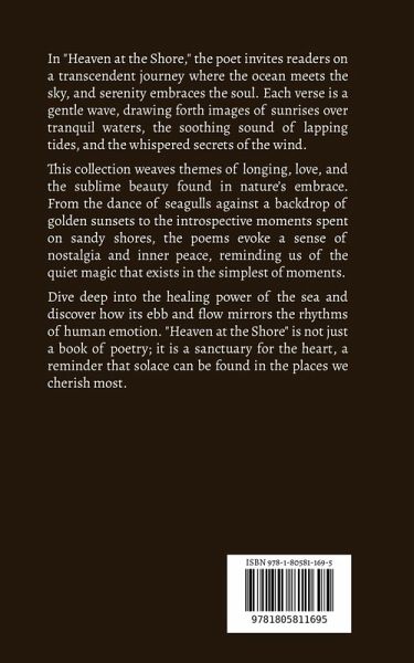 In "Heaven at the Shore," the poet invites readers on a transcendent journey where the ocean meets the sky, and serenity embraces the soul. Each verse is a gentle wave, drawing forth images of sunrises over tranquil waters, the soothing sound of lapping tides, and the whispered secrets of the wind. This collection weaves themes of longing, love, and the sublime beauty found in nature's embrace. From the dance of seagulls against a backdrop of golden sunsets to the introspective moments spent on sandy shores, the poems evoke a sense of nostalgia and inner peace, reminding us of the quiet magic that exists in the simplest of moments. Dive deep into the healing power of the sea and discover how its ebb and flow mirrors the rhythms of human emotion. "Heaven at the Shore" is not just a book of poetry; it is a sanctuary for the heart, a reminder that solace can be found in the places we cherish most.