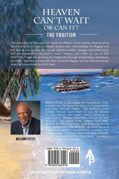 This is the third volume in the series. Continuing with characters introduced in In "Heaven Can't Wait or Can it? Dreams Of Love, Deceit and Hope" and Heaven Can't Wait or Can it? The Sequel, this novel, "Heaven Can't Wait: or Can it? THE FRUITION," follows lead character Maggie and her friends as they seek the fortunes of a happy life through relationships, adventure, and faith as they take a cruise from New York to Bermuda. Unfortunately, the trip did not go without conflict, danger, and misfortune. Along the way, everyone involved seems to learn about themselves, as well as about others whom they come into contact. In the end, faith seems to guide their actions and bring them safely back home.