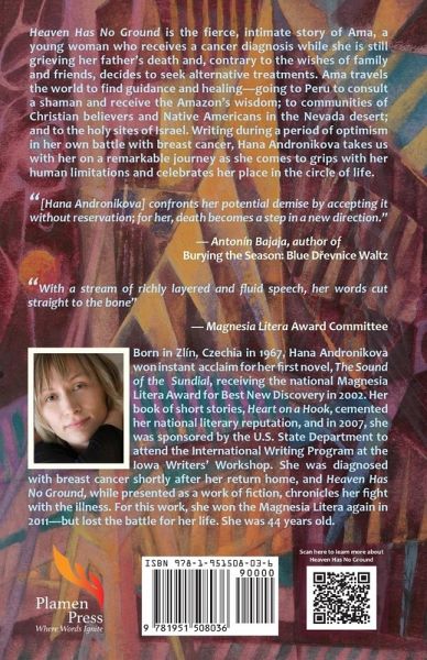 Heaven Has No Ground is the fierce, intimate story of Ama, a young woman who is reckoning with the death of her father when she receives her own cancer diagnosis and, contrary to the wishes of family and friends, decides to seek alternative treatments rather than conventional chemotherapy and radiation. While this book was published as a work of fiction to great acclaim in the Czech Republic, it follows very closely the life story of its author, Hana Andronikova, who wrote the book during a period of optimism in her own battle with breast cancer. Much like Hana, Ama travels the world to find guidance and healing-going to Peru to consult a shaman and receive the Amazon's wisdom; to communities of Christian believers and Native Americans in the Nevada desert; and to the holy sites of Israel. Using striking metaphors and intensely emotional language in journal entries, emails, and narrative fragments, Andronikova takes us with her on a remarkable journey as she comes to grips with her human limitations and celebrates her place in the circle of life.