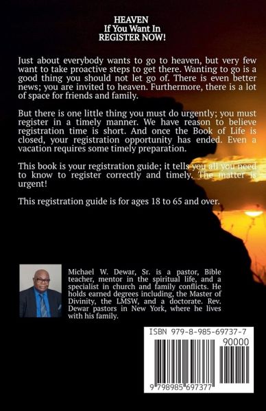 This book is about you securing a place in heaven before death comes to you. The Bible and Christian theology teach that the offer to go to heaven is taken off the table when you die. The choice for heaven, therefore, must be made before death comes to you; otherwise, the opportunity for heaven is forever lost. You must have prior registration to the Lamb's Book of Life. Since there are many misconceptions as to who, how, and when you get to heaven, many people have a false sense of security. This book is your trusted registration guide. It clarifies heaven's admissions requirements and walks you through the registration process. Failure to register correctly before you die is irrevocably disastrous. Happy Registration!