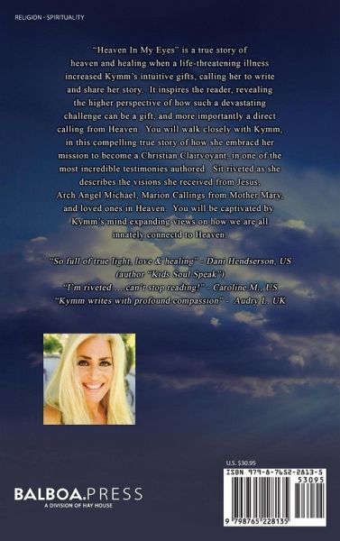 "Heaven In My Eyes" is a true story of heaven and healing when a life-threatening illness increased Kymm's intuitive gifts, calling her to write and share her story. It Inspires the reader, revealing the higher perspective of how such a devastating challenge can be a gift, and more importantly a direct calling from Heaven. You will walk closely with Kymm, in this compelling true story of how she embraced her mission to become a Christian Clairvoyant, in one of the most incredible testimonies authored. Sit riveted as she describes the visions she received from Jesus, Arch Angel Michael, Marion Callings from Mother Mary, and loved ones in Heaven. You will be captivated by Kymm's mind expanding views on how we are all innately connected to Heaven. "So full of true light, love & healing" -Dani Hendserson, US (author "Kids Soul Speak") "I'm riveted...can't stop reading!" - Caroline M., US "Kymm writes with profound compassion" -Audry L. UK
