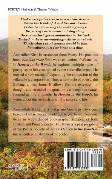 Amanullah Khan is passionate about Poetry. His previous book, Barefoot in the Rain, was a collection of villanelles. In Heaven in the Woods, he explores multiple styles of poetry, as he felt constrained by the villanelle format. He created a new means of expanding the expression of the villanelle's composition. Thus, a new style of poetry, the Ballanelle, was born. It allows for the extension of thought and stretched imagination yet keeps the reader focused as in a villanelle. In Heaven in the Woods, he writes about themes such as family, nature and life.