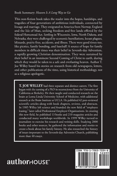 Book Summary: Heaven Is A Long Way to Go This non-fiction book takes the reader into the hopes, hardships, and tragedies of four generations of ambitious individuals, connected by lineage and marriage. They emigrated to America from Norway, England and the Isle of Man, seeking freedom and free lands offered by the federal Homestead Act. Settling in Wisconsin, Iowa, North Dakota, and Nebraska, they were challenged by economic humiliations, locust plagues, blizzards, prairie fires, accidents, and illness. There were good times too, like picnics, family bonding, and baseball! A source of hope for family members in difficult times was their belief in Seventh-day Adventism, a rapidly growing Christian denomination. They were sustained by their belief in an imminent Second Coming of Christ to earth, during which they would be taken to a safe and everlasting heaven. Author T. Joe Willey based his stories on research from old newspapers, letters, and other publications of the time, using historical methodology, not as a religious apologetic.