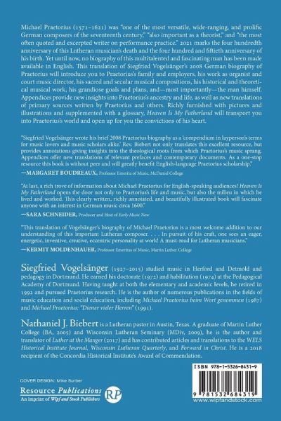 Michael Praetorius (1571-1621) was ""one of the most versatile, wide-ranging, and prolific German composers of the seventeenth century,"" ""also important as a theorist,"" and ""the most often quoted and excerpted writer on performance practice."" 2021 marks the four hundredth anniversary of this Lutheran musician's death and the four hundred and fiftieth anniversary of his birth. Yet until now, no biography of this multitalented and fascinating man has been made available in English. This translation of Siegfried Vogelsanger's 2008 German biography of Praetorius will introduce you to Praetorius's family and employers, his work as organist and court music director, his sacred and secular musical compositions, his historical and theoretical musical work, his grandiose goals and plans, and--most importantly--the man himself. Appendices provide new insights into Praetorius's ancestry and life, as well as new translations of primary sources written by Praetorius and others. Richly furnished with pictures and illustrations and supplemented with a glossary, Heaven Is My Fatherland will transport you into Praetorius's world and open up for you the convictions of his heart.