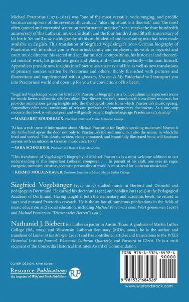 Michael Praetorius (1571-1621) was ""one of the most versatile, wide-ranging, and prolific German composers of the seventeenth century,"" ""also important as a theorist,"" and ""the most often quoted and excerpted writer on performance practice."" 2021 marks the four hundredth anniversary of this Lutheran musician's death and the four hundred and fiftieth anniversary of his birth. Yet until now, no biography of this multitalented and fascinating man has been made available in English. This translation of Siegfried Vogelsanger's 2008 German biography of Praetorius will introduce you to Praetorius's family and employers, his work as organist and court music director, his sacred and secular musical compositions, his historical and theoretical musical work, his grandiose goals and plans, and--most importantly--the man himself. Appendices provide new insights into Praetorius's ancestry and life, as well as new translations of primary sources written by Praetorius and others. Richly furnished with pictures and illustrations and supplemented with a glossary, Heaven Is My Fatherland will transport you into Praetorius's world and open up for you the convictions of his heart.