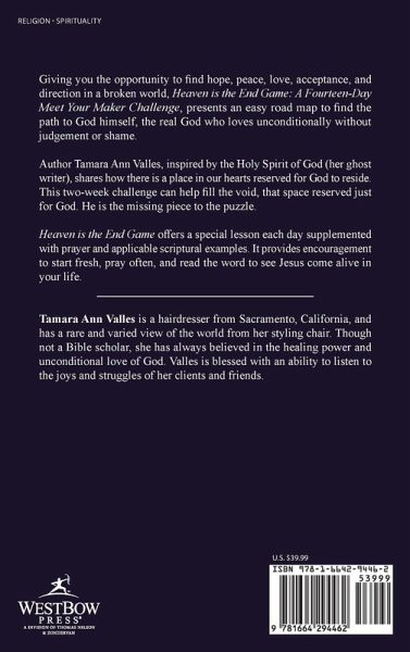 Giving you the opportunity to find hope, peace, love, acceptance, and direction in a broken world, Heaven is the End Game: A Fourteen-Day Meet Your Maker Challenge, presents an easy road map to find the path to God himself, the real God who loves unconditionally without judgement or shame. Author Tamara Ann Valles, inspired by the Holy Spirit of God (her ghost writer), shares how there is a place in our hearts reserved for God to reside. This two-week challenge can help fill the void, that space reserved just for God. He is the missing piece to the puzzle. Heaven is the End Game offers a special lesson each day supplemented with prayer and applicable scriptural examples. It provides encouragement to start fresh, pray often, and read the word to see Jesus come alive in your life.