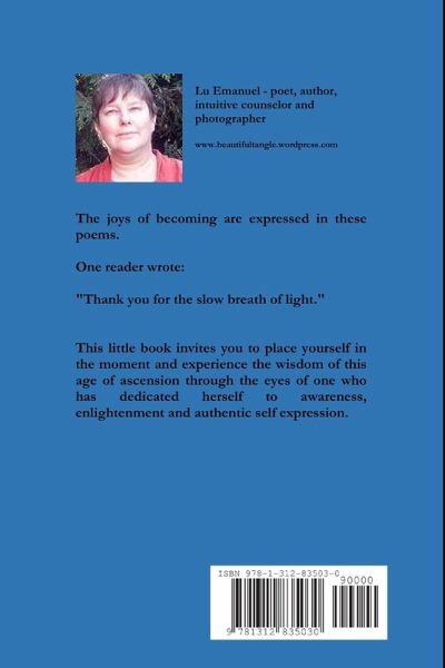 Lu Emanuel has created two other books of poems and two self-help books to guide readers to live a more soulful and joyous life. These are available through the usual online book sellers. You can find poetry, short stories and photography by Lu Emanuel on her blog www.hereandnowwithyou.blogspot.com. You can find inspiration and advice through the chronicles of Lu Emanuel's journey to joy on her blog www.beingluemanuel.blogspot.com.
