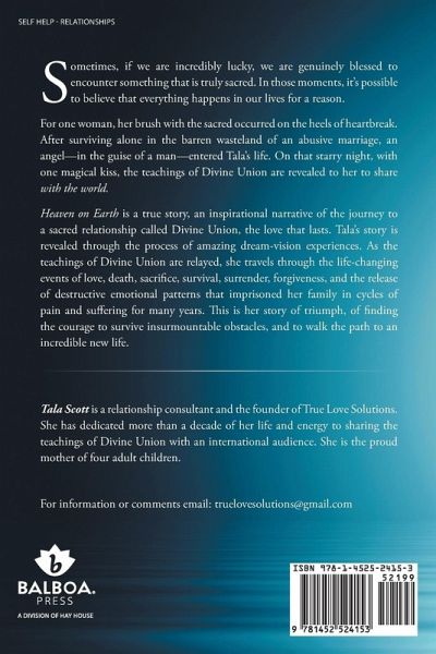 Sometimes, if we are incredibly lucky, we are genuinely blessed to encounter something that is truly sacred. In those moments, it's possible to believe that everything happens in our lives for a reason. For one woman, her brush with the sacred occurred on the heels of heartbreak. After surviving alone in the barren wasteland of an abusive marriage, an angel-in the guise of a man-entered Tala's life. On that starry night, with one magical kiss, the teachings of Divine Union are revealed to her to share with the world. Heaven on Earth is a true story, an inspirational narrative of the journey to a sacred relationship called Divine Union, the love that lasts. Tala's story is revealed through the process of amazing dream-vision experiences. As the teachings of Divine Union are relayed, she travels through the life-changing events of love, death, sacrifice, survival, surrender, forgiveness, and the release of destructive emotional patterns that imprisoned her family in cycles of pain and suffering for many years. This is her story of triumph, of finding the courage to survive insurmountable obstacles, and to walk the path to an incredible new life.