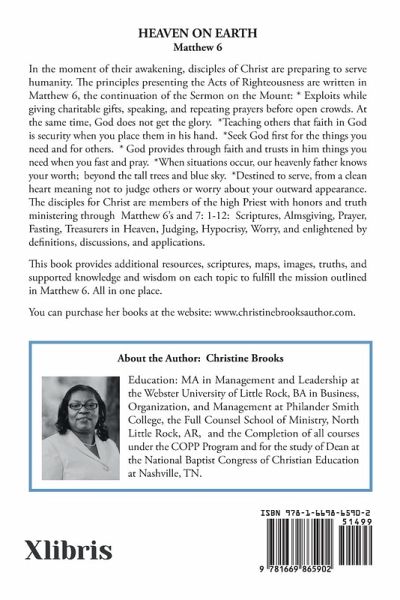 HEAVEN ON EARTH Matthew 6 In the moment of their awakening, disciples of Christ are preparing to serve humanity. The principles presenting the Acts of Righteousness are written in Matthew 6, the continuation of the Sermon on the Mount: * Exploits while giving charitable gifts, speaking, and repeating prayers before open crowds. At the same time, God does not get the glory. *Teaching others that faith in God is security when you place them in his hand. *Seek God first for the things you need and for others. * God provides through faith and trusts in him things you need when you fast and pray. *When situations occur, our heavenly father knows your worth; beyond the tall trees and blue sky. *Destined to serve, from a clean heart meaning not to judge others or worry about your outward appearance. The disciples for Christ are members of the high Priest with honors and truth ministering through Matthew 6's and 7: 1-12: Scriptures, Almsgiving, Prayer, Fasting, Treasurers in Heaven, Judging, Hypocrisy, Worry, and enlightened by definitions, discussions, and applications. This book provides additional resources, scriptures, maps, images, truths, and supported knowledge and wisdom on each topic to fulfill the mission outlined in Matthew 6. All in one place. You can purchase her books at the website: www.christinebrooksauthor.com.