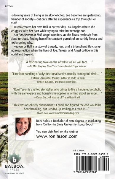 Following years of living in an alcoholic fog, Joe becomes an upstanding member of society-but only after he experiences a trip through Hell itself. Teresa creates her own Hell in current day Los Angeles where she struggles with her past while trying to raise her teenage son. Am I in Heaven or Hell, Angel wonders, as she floats restlessly from cloud to cloud, finding herself in constant pursuit of an earthly Teresa and not knowing why. Heaven or Hell is a story of tragedy, loss, and a triumphant life-changing resurrection when the lives of Joe, Teresa, and Angel collide in this world and beyond. "... A fascinating take on the afterlife we all will face...." -G. Miki Hayden, New York Times--lauded Edgar winner "Excellent handling of a dysfunctional family actually coming full circle..." -Victoria Christopher-Murray, author of Truth Be Told, Sinners & Saints, and many other titles "Roni Teson is a gifted storyteller who brings to life a hardened alcoholic with the same grace and honesty she applies in writing about an angel..." -Karen Coccioli, Author of The Yellow Braid "This was absolutely phenomenal! I cried and figured the end would be heartbreaking, but I ended up smiling as I read it..." -Diana Cox, www.novelproofreading.com You can visit Roni on the web at www.roniteson.com