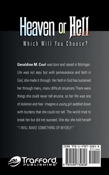 This book is about the vast differences between heaven and hell. It tells of Geraldine's experiences after a suicide attempt and what happens to her on her journey through heaven and hell. This book tells of the horrors she went through while in hell and the wonders she beheld while in heaven. She prays the horrors she went through that no one else will have to endure. This book tells how people can become children of God and be assured a place in heaven.