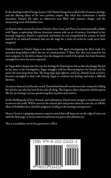 In the dazzling world of Savage Scents, CEO Daniel Savage has crafted a life of success, prestige, and the alluring allure of his own perfume empire. But when fate orchestrates a fateful encounter, Daniel's life takes an unforeseen turn filled with romance, danger, and the intoxicating scent of forbidden love. As Daniel rushes to meet his closest friends, Chris, Liam, and Pierce, he unintentionally collides with Tegan, a captivating African American woman with an air of mystery. Enveloped in her heavenly fragrance, Daniel is captivated, and before he can comprehend his actions, he finds himself in an awkward moment that sets the stage for a series of events he could never have imagined. Unbeknownst to Daniel, Tegan is an undercover FBI agent investigating the illicit trade of a powerful drug hidden within the one of a kind perfume "I Want You" that was created by his own company. As she delves deeper into the dangerous world of deception, her heart becomes entangled in a love she never expected. As Tegan delves deeper into the case, her feelings for Daniel grow, but so does the danger. Bound by her duty to the investigation, Tegan struggles with her blossoming love for Daniel and the secret she must keep from him. The drug ring's grip tightens, and Lisa, Daniel's loyal secretary, becomes entangled in their web, forcing Tegan to confront her feelings and make a difficult decision. As trust is shattered and loyalty tested, Daniel finds himself torn between the woman he's falling for and the one who has been by his side all along. The fragrant allure of passion and deception fills the air, leaving everyone questioning their loyalties and motives. In this thrilling tale of love, betrayal, and redemption, Daniel must navigate a treacherous path to uncover the truth. Will he uncover the sinister plot and protect those he cares for, or will the allure of forbidden love cloud his judgment, leading to devastating consequences? Heaven Scent is a gripping romance suspense novel that will keep you on the edge of your seat until the final page, as secrets unravel and hearts are put to the ultimate test. This is a standalone novel that guarantees a HEA